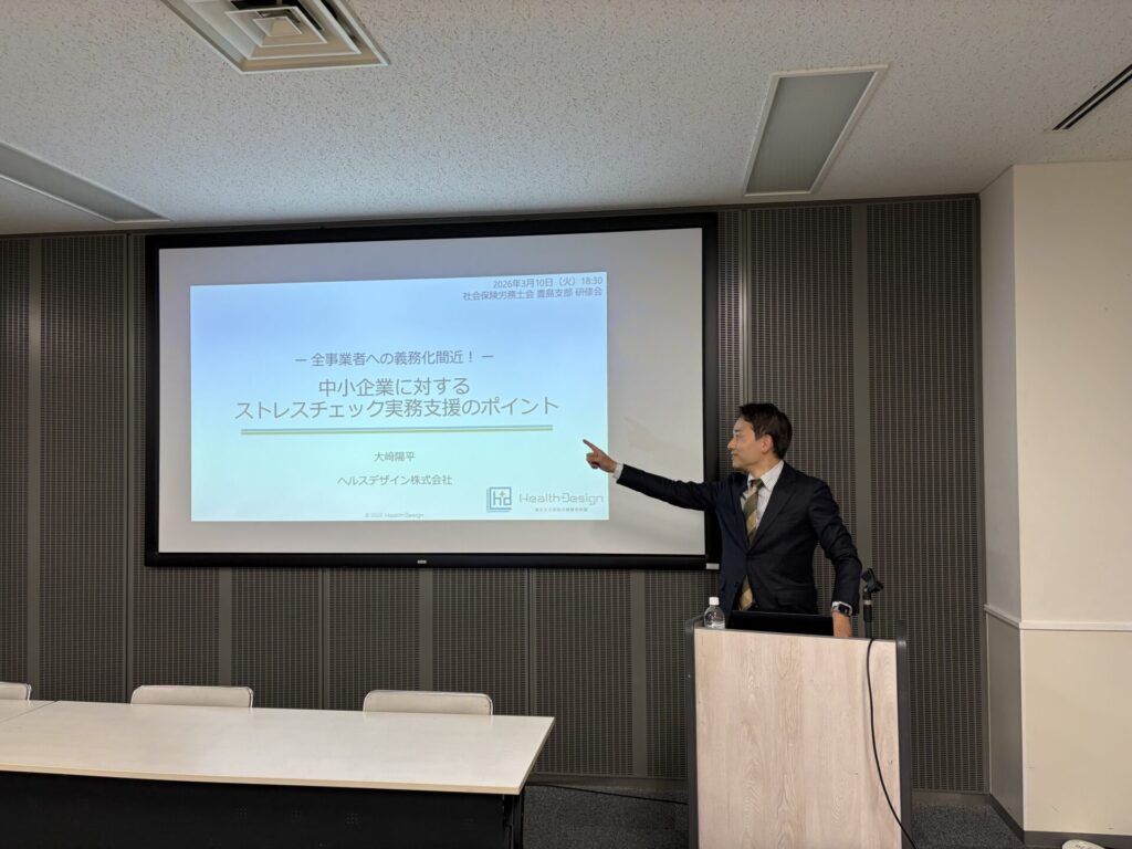 社会保険労務士会の研修会において弊社代表取締役である大﨑産業医が講師を務め、「中小企業に対するストレスチェック実務支援のポイント」をテーマに2時間のセミナーを実施しました。